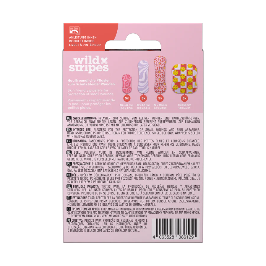 Wild Stripes Classic Sensitive Pastel Fun is a medical product compliant with EU requirements, offering more than just protection. Bandages with fun patterns and pastel colors bring positivity to every day while providing reliable protection for minor wounds. The set is ideal for people with sensitive skin—bandages are skin-friendly, hypoallergenic, and offer super-strong adhesion even with an active lifestyle.