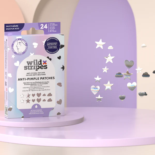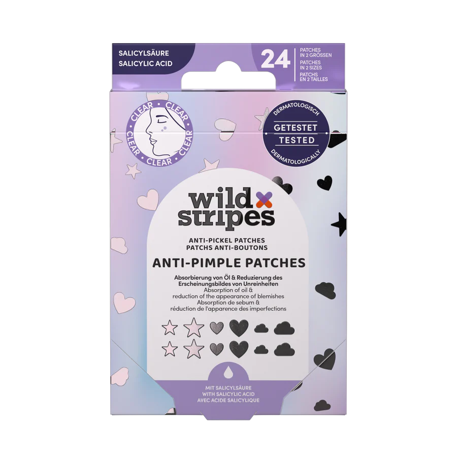 End pimples stylishly! Wild Stripes® Holo Clear Anti-Pimple Patches are trendy and effective blemish patches that combine skin care with a playful appearance. The hydrocolloid patches are enriched with hyaluronic acid, which helps to moisturize and soothe the skin while the patch material absorbs excess sebum and dirt directly from the problem area.