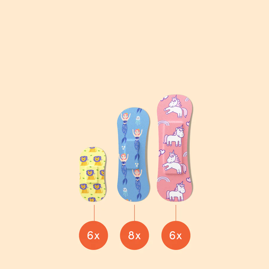 The bandages are waterproof and last on the skin for up to 24 hours, providing protection against dirt and bacteria. Removal is painless thanks to a gentle adhesive and does not irritate the skin. Patented shapes and colorful designs make wearing the bandages fun for both children and adults. Ideal for home use, school bags, or taking along on travel.